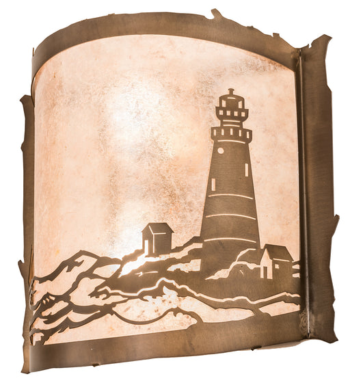 A Canoe on a lake is paddled by the woods on this nature sport wall sconce. The fixture is finished in Antique Copper, has Silver Mica panels and i...