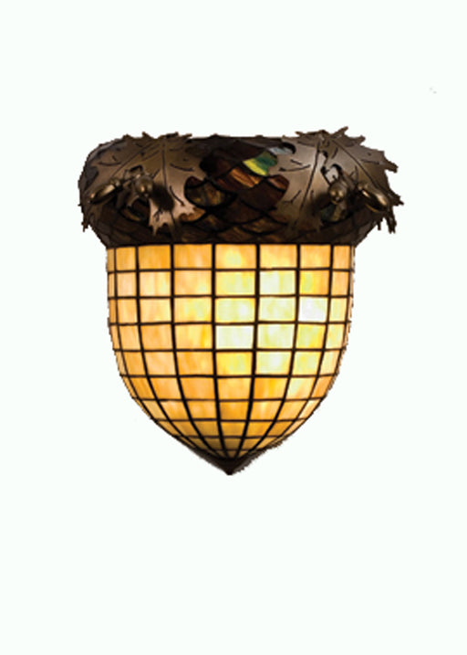 Majestic as the mighty oak is this leaf adorned wall sconce in an antique copper finish. A lighted stained glass acorn, in multi toned Autumn Green...