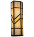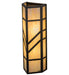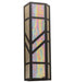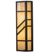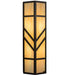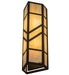 Striking southwestern Mission design for the ages. A charming aura projects from Beige Iridescent art glass with bold geometric styling. Complemented with an Oil Rubbed Bronze finished frame and hardware, the handcrafted wall fixture is ideal for ambient decorative lighting in a corridor or any room where you want to make a bold design statement. Handmade in the USA, this sconce is available in custom designs, colors and sizes, as well as with dimmable energy efficient lamping. It is UL and cUL listed for damp and dry locations.