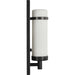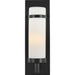 Ease yourself into a state of complete bliss and relaxation under the luxurious glow of this wall sconce. A stunning, cylinder-shaped etched opal glass diffuser held in place by a thin metal bar recalls visions of elegant candlesticks. The diffuser sits on top of a pedestal-like light base attached to a beautiful black backplate.