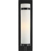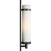Ease yourself into a state of complete bliss and relaxation under the luxurious glow of this wall sconce. A stunning, cylinder-shaped etched opal glass diffuser held in place by a thin metal bar recalls visions of elegant candlesticks. The diffuser sits on top of a pedestal-like light base attached to a beautiful black backplate.