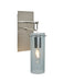 The Juni 10 Blue Wall Pendant is a transitional wall sconce design composed of a transparent blue glass cylinder, with an interesting bubble pattern blown randomly throughout the glass The pleasing play of light through each shade`s bubble accents make for a striking affect along with the prominent display of the lamp filament behind the glass. The rectilinear styled wall canopy includes standoff, cord support loop, and adjustable 10` suspension cord.These stylish and functional luminaries are offered in a beautiful Satin Nickel finish.