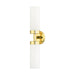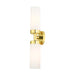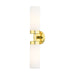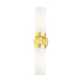 Add a dash of character and radiance to your home with this vanity sconce. This two-light fixture from the Aero Collection features a polished brass finish with two satin opal white glass cylinder shades on either side. The clean lines of the back plate complement the cylindrical glass shades creating a minimal, sleek, urban look that works well in most decors. This fixture adds upscale charm and contemporary aesthetics to your home.