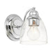 Whether it`s style or practical lighting, this vanity sconce is the perfect addition to your bathroom. This single-light fixture from the Montgomery Collection features a clear hand-blown glass shade and is shown in a polished chrome finish. The clean graceful lines of the back plate complement the shade, creating an understated look that works well in most decors. Classic elegance combines with contemporary appeal to enhance any home in style.