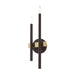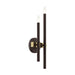 The clean lines of the Denmark collection remind of early modern Scandinavian style. The slim candles rise on the contrasting bar at different heights dynamically emulating the shape of a city skyline. This double-light exposed bulb sconce comes in a bronze finish with antique brass finish bars. Versatile enough for almost any interior where dramatic statement is needed such as a bathroom, hallway, dining room, living room or bedroom.