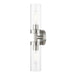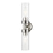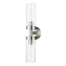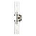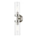 Add a dash of character and radiance to your home with this wall sconce. This two-light fixture from the Ludlow Collection features a brushed nickel finish with a clear glass. The clean lines of the back plate complement the cylindrical glass shades creating a minimal, sleek, urban look that works well in most decors. This fixture adds upscale charm and contemporary aesthetics to your home.