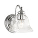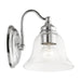 Bring a refined lighting style to your bath area with this Moreland collection one light vanity sconce. Shown in a polished chrome finish and clear glass.
