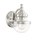 Sleek and simple lines define this beautiful brushed nickel finish single light sconce from the Oldwick collection. The clean, bold look of modernity blends with a raw industrial inspiration and hand blown clear glass give this design a versatile and eclectic look that works with nearly any style of home decor.