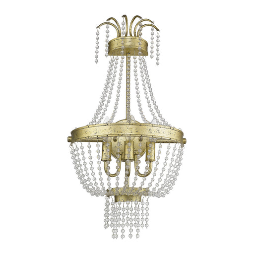A beautiful cascade of clear crystal beads creates a striking effect of refracted light. This three light wall sconce is finished in a hand applied...