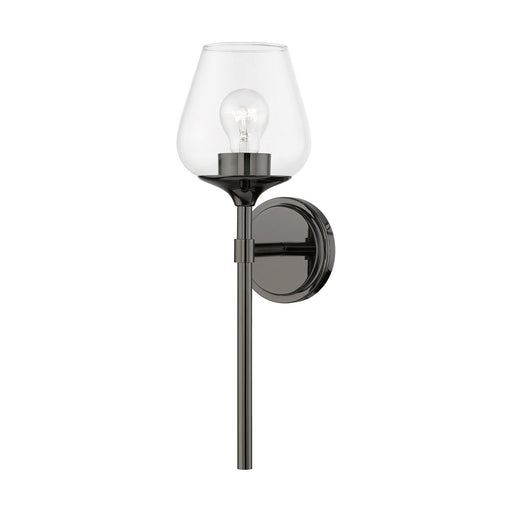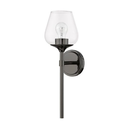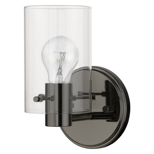 The stunning Quincy sconce features a black chrome finish with clear glass. This sleek design will brighten up any bathroom or wall application.Det...