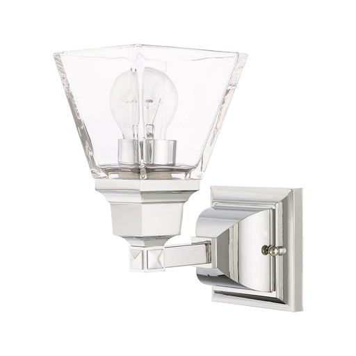 The Mission collection has clean lines with geometric forms. This one light bath vanity light features clear glass on polished chrome, square style...