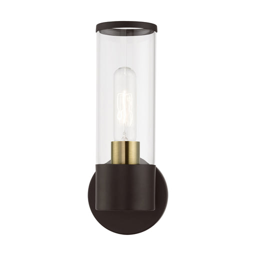 Bring a refined lighting style to your bath area with this downtown collection single light sconce. Shown in a bronze finish with antique brass fin...
