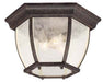 This 3-light ceiling mount fixture is from our Collection and is made of durable cast aluminum. It will not rust and resists corrosion. This lantern features clear seeded glass panes.