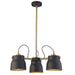 The Euro Industrial collection features matte black metal shades complimented with harvest brass nobs, hardware and rods. The interior of the metal shades is plated in a reflective black. Wire comes out of socket for an industrial look. (Other chandelier sizes and wall sconce available). 3 light chandelier shown.