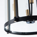 The Bonita Collection designed by Kevin Kraemer, features black frames with clear glassware and brass accents. The black metal frame provides a striking contrast to the warm brass accents, creating a visually stunning centerpiece for any space. Its intricate design, featuring a cage-like structure with glass panels, adds a touch of vintage charm while emitting a warm, inviting glow when lit. (4 lite - 17"D. lantern chandelier shown, smaller 13"D. also available)