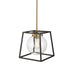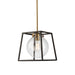 The "Bridgetown" collection single pendant features a clean and transitional design. The outer frame is a black tapper square while the interior is plated in a rich harvest brass. The glassware is clear and circular.