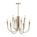 The Bronte Collection chandelier presents a classic design with tapered arms, accentuated by a warm brushed brass frame that exudes a touch of modern sophistication. 9 lite 25.5" diameter chandelier shown. (Also available in a semi-gloss black finish)