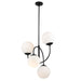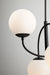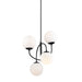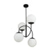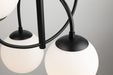 The Moonglow collection from designer Steven Sabados of S&C features multi size opal white glass spheres incorporated in a matte black frame. 4 light chandelier shown. (also available with polished nickel frame).