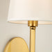 From the S&C design firm, with strict direction from Steven Sabados, the Rhythm Collection sconce features a traditional type frame with flat tubular arms. The frame is finished in rich plated brushed gold and complimented with linen hardback white shades.