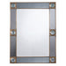 A beautiful steel blue colored mirror frame accented with magnifying glass rounds set in antique brass. The center mirror is plain so it is perfect for a hallway or powder room. Can be hung vertically or horizontally.