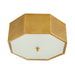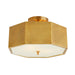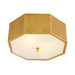 The hexagonal shape of this semi-flush mount draws the eye with its multi-faceted façade. Crafted of iron, this fixture features an antique brass exterior and polished brass interior for an extra element of shine. Diagonal detailing adds texture to the side panels and canopy to create a look that is both edgy and elegant. A frosted glass diffuser helps to disguise two bulbs, while simultaneously working to soften the glow. Finish will vary.