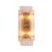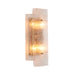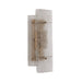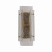 A clear glass plate layered with crackled glass form the striking two-light sconce that is the Metairie. An antique brass iron backplate sets a refined tone to the sculptural form. Finish will vary. Damp-rated, although limited covered outdoor areas may affect finish.