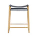 A marriage of form and function, this counter stool has a refined meets rustic vibe. An indigo leather seat lends an organic touch to the modern style of its antique brass frame. The top stretchers on either side have been wrapped with matching leather to create cohesiveness. The unrestricting design of no back or arms creates a minimalist profile, which makes this ideal to tuck under a counter. Finish and leather may vary.