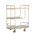 Serve your guests without forfeiting function or style. Crafted with an iron frame in an antique brass finish each of the three tiers of this capsule-shaped bar cart features a different element. The top tier is inset with solid white marble the second tier is inset with clear glass and the third tier is inset with mirrored glass. The use of mixed materials delivers a luxe visual appeal. Finish may vary.