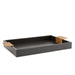 A streamlined, graphite leather tray is made modern with L-shaped, Brutalist-inspired cast-antique brass handles that wrap the frame. The Sedford`s angular construction and smart juxtaposition of materials lend a sophisticated edge to any space.
