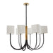 In the classic tulip-style silhouette, the Ruskin chandelier is modernized with graceful arms in blackened iron, with a banded central column of antique brass iron. Traditional tapered shades are swapped for softly rounded, triangular, off-white microfiber shades that nod to mid-century design.