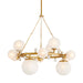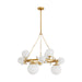 A representation of modern sophistication, this multi-light electrolier defines a space. Varying sizes of opal swirl glass globes embellish a sleek and slender circular steel frame that emphasizes the slightly whimsical design. Small, clear crystal knobs contrast beautifully with an antique brass finish and the visual textures of a swirl finish. Additional pipe available (PIPE-422). Finish will vary. Damp rated, though limited covered outdoor conditions may affect finish.