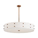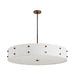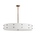 Clean, sophisticated and edgy, this eight-light chandelier has a sleek and narrow silhouette that is visually dramatic. A steel frame, finished in heritage brass, elegantly presents a slender white linen shade. Matching brass rivets with a knurling detail accent the shade, incorporating the two elements into the piece as if they are one. Perfect for hanging over an island in the kitchen or over a table with a centerpiece to spotlight. Additional pipe available (PIPE-172). Damp rated, though limited outdoor conditions may affect finish.
