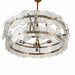 Inspired by the natural flow of water, clear seedy glass florets layer and overlap like a luxe puzzle. Anchored to a double drum frame of antique brass steel, their glow is refracted and reflected to deliver the feeling of movement.