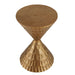 Our cast aluminum accent table is dynamically tapered and finished with a hammered, feathered texture and shining antique brass finish. With a shape inspired by an hourglass, the substantial base and smooth top were designed to enhance any seating area with texture and shine. Finish will vary.
