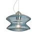 The Zen Blue Pendant is a transitional design composed of a transparent blue "Hour-Glass" shaped glass , with an interesting bubble pattern blown randomly throughout the glass The pleasing play of light through the shade's bubble accents makes for a striking affect, created by the exposed light source positioned inside the shade. The cable pendant fixture is equipped with a 10' silver aircraft cable and AWM cordset, and a dome monopoint canopy. These stylish and functional luminaries are offered in a beautiful Satin Nickel finish.