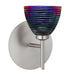Divi has a classical bell shape that complements aesthetic, while also built for optimal illumination. Our Black Dicro Wavy glass is a blown glass with black striping on the glossy outside, and a technologically advanced dichroic coating applied to the inside. The coating contains multiple micro-layers of metals that create unique optical properties, which effectively alter both the reflected and transmitted light. So unlit, it appears like a mirror, when lit, it becomes translucent with an array of multicolored blue-purple effects. The mini sconce is equipped with a decorative lamp holder mounted to either a low profile round or square canopy. These stylish and functional luminaries are offered in a beautiful Satin Nickel finish.