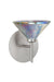 The Kona features a wide cone-shaped glass, that demonstrates contemporary sensibilities. Our Dicro glass is clear blown glass with a technologically advanced dichroic coating applied to the inside. The coating contains multiple micro-layers of metals that create unique optical properties, which effectively alter both the reflected and transmitted light. So unlit, it appears like a mirror, when lit, it becomes translucent with an array of multicolored blue-purple effects. The mini sconce is equipped with a decorative lamp holder mounted to either a low profile round or square canopy. These stylish and functional luminaries are offered in a beautiful Satin Nickel finish.
