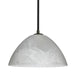 Tessa has a classical bell shape that complements aesthetic, while also built for optimal illumination. Our Marble glass is a pressed glass that features swirls of white throughout semi-translucent frost, to create a faux alabaster appearance. When lit this gives off a light that is functional and soothing. The smooth satin finish on the clear outer layer is a result of an extensive etching process. This handcrafted glass uses a process where every glass is consistently produced using a press mold, keeping variations to a minimum. The stem pendant fixture is equipped with an adjustable telescoping section, 4 connectable stem sections (3", 6", 12", and 18") and low Profile flat monopoint canopy. These stylish and functional luminaries are offered in a beautiful Black finish.