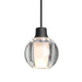 The Boca LED Mini Pendant is comprised of an appealing globe-shaped clear solid glass, accented by an interesting inner frosted tube to diffuse the light source. The splash of concealed LED illumination through the solid glass makes the Boca 3 a stunning display of light refractions. The 12V cord pendant fixture is equipped with a 10' coaxial cord with teflon jacket and an "Easy Install" Dome monopoint canopy. These stylish and functional luminaries are offered in a beautiful Black finish.
