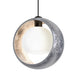 The Pogo is a playful double-glass pendant, with a globe-shaped opal glass centered in a radiused glass ring. Our Silver Foil glass is sparkling and metallic. Distressed metal foil is applied to the inner surface of a glossy clear blown glass. The silver color complements the soft white Opal cased glass, which can suit any classic or modern decor. Opal has a very tranquil glow that is pleasing in appearance, as the silver foil sparkles with the accents from that glow. The smooth satin finish on the opal's outer layer is a result of an extensive etching process. This blown glass combination is handcrafted by a skilled artisan, utilizing century-old techniques passed down from generation to generation. The 12V cord pendant fixture is equipped with a 10' braided coaxial cord with teflon jacket and a low profile flat monopoint canopy. These stylish and functional luminaries are offered in a beautiful Black finish.