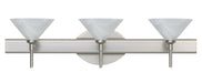 The Kona pendant features a wide cone-shaped glass, that demonstrates contemporary sensibilities. Our Marble glass is a pressed glass that features swirls of white throughout semi-translucent frost, to create a faux alabaster appearance. When lit this gives off a light that is functional and soothing. The smooth satin finish on the clear outer layer is a result of an extensive etching process. This handcrafted glass uses a process where every glass is consistently produced using a press mold, keeping variations to a minimum. The vanity fixture is equipped with decorative lamp holders, removable finials, linear rectangular housing, and a removable low profile oval canopy cover. These stylish and functional luminaries are offered in a beautiful Satin Nickel finish.
