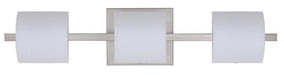 Contemporary Paolo enclosed half-cylinder design features handcrafted glass. This modern wall light offers flexible design potential for a variety of bath/vanity decorating schemes. Mount horizontally or vertically. ADA-Compliant. Our Opal glass is a soft white cased glass that can suit any classic or modern decor. Opal has a very tranquil glow that is pleasing in appearance. The smooth satin finish on the clear outer layer is a result of an extensive etching process. This blown glass is handcrafted by a skilled artisan, utilizing century-old techniques passed down from generation to generation. The vanity fixture is equipped with plated steel square lamp holders mounted to linear rectangular tubing, and a low profile square canopy cover. These stylish and functional luminaries are offered in a beautiful Satin Nickel finish.