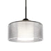 The Belu pendant features a ribbed drum glass shade that adds a touch of elegance and sophistication to any space. The glass shade has horizontal ribbed detailing and a inner white acrylic shield, which creates a beautiful and distinctive visual effect when illuminated. The cord pendant fixture is equipped with a 10' SVT cordset. These stylish and functional luminaries are offered in a beautiful Black finish.