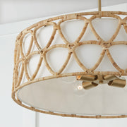The Tulum Large Pendant creates a new look on natural style. Handwrapped rattan highlights the unique pattern which contrasts against the crisp, white fabric drum shade. Modern shapes in natural tones paired with hints of Matte Brass bring bohemian chic to any space.