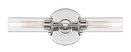 Two sleek clear glass cylinder shades combine with the classic round backplate of the Modina 2 light linear wall sconce to create this timeless favorite from Craftmade that can be mounted horizontally or vertically. Dimmable 6 Watt LED filament bulbs are included.