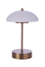 Take it with you! Rechargeable and portable LED table lamp with glass shade with touch button on/off dimming, included charging cord with quick recharging and over 8 hours of continuous use on high is damp rated for use indoors or outdoors.