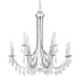 A classic yet moderns style with slim, upward curved arms strung in curtains of faceted crystal jewels, create visual interest. Complementary to a variety of home décor styles this chandelier will work in any space.
