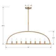 The Abbott linear chandelier presents a simple, streamlined shape and clean lines. The open-concept frame features a metal arch and a sleek, narrow rod with a series of thin bulbs. Mounted above an island or over a dining room table, this fixture appeals to a minimalist sense of style. The Abbott comes in vibrant gold and black finish.