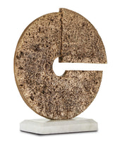 The Daman Brass Disc has a heavily pitted surface that is rougher than a rough-case treatment, which brings the gold sculpture an intense texture. Adding to this effect is the aged brass finish that collects in the larger crevices to create added patina. A design detail of note is how the rectangular marble base is beveled.