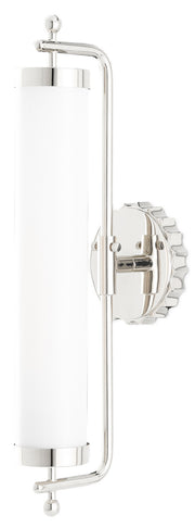 The Latimer Nickel Wall Sconce in our Barry Goralnick Collection is made of metal in a polished nickel finish and a tubular milk-glass shade. This silver sconce is certified for damp locations.